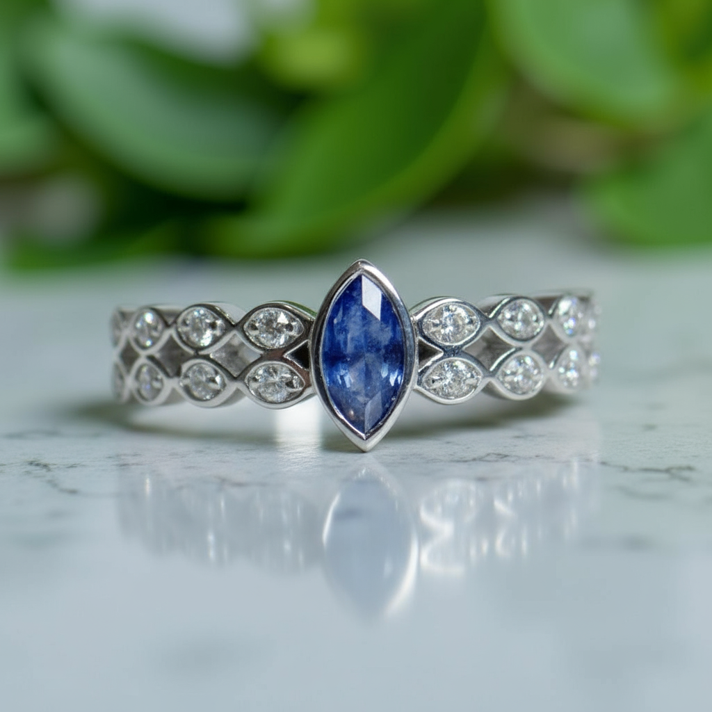 Our Sterling Silver Double Marquise Band ring features a central marquise setting for your loved ones inclusions, embraced by twin bands of sparking CZ marquise crystals.  This ring is a stunning blend of elegance and meaning.