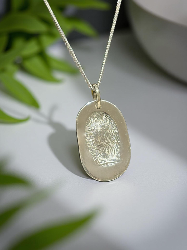 When making your necklace, your loved ones finger is gently pressed onto our silver clay, which is then shaped, fired, and hand-polished for a unique, bespoke, individual piece of jewellery.