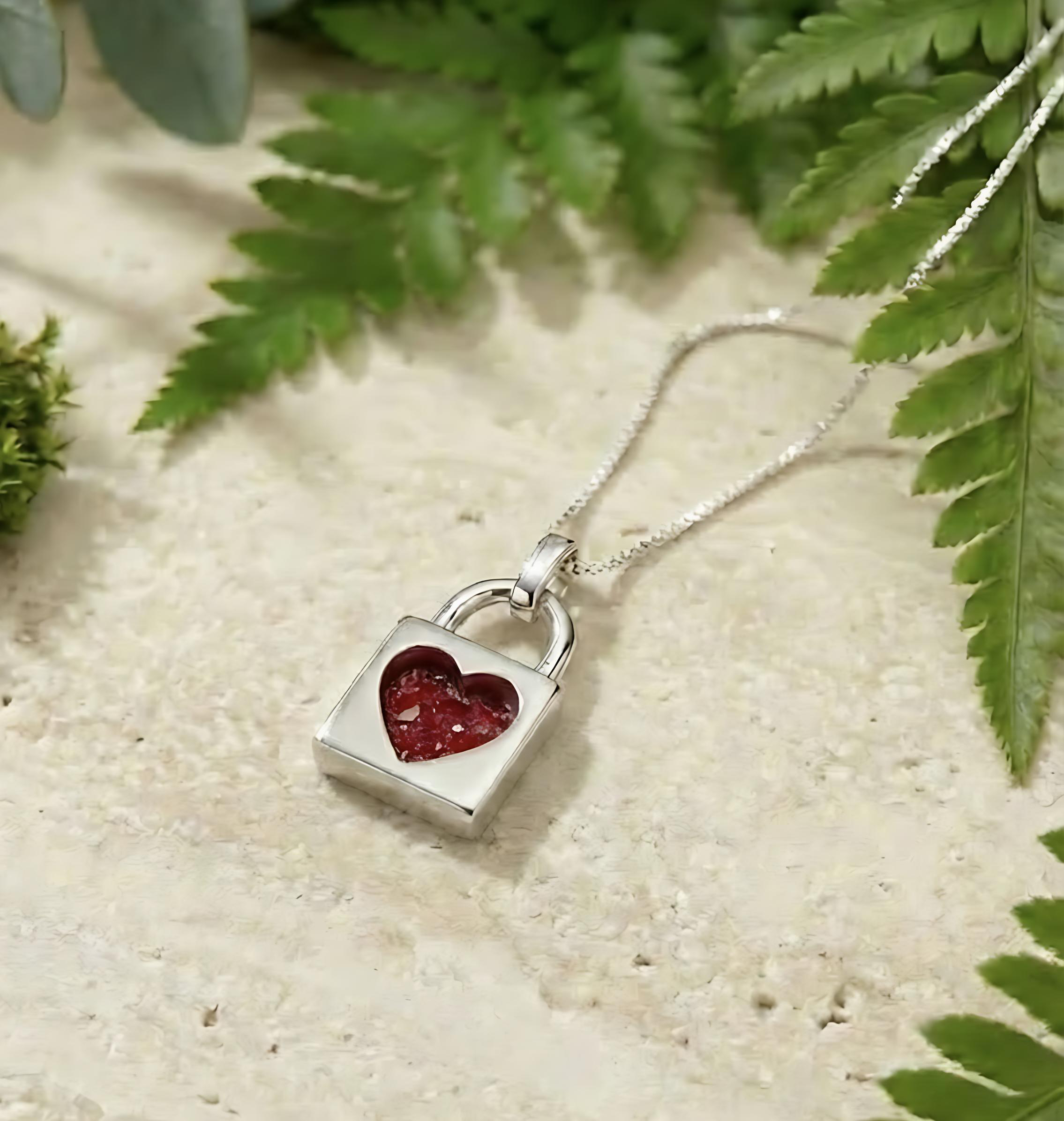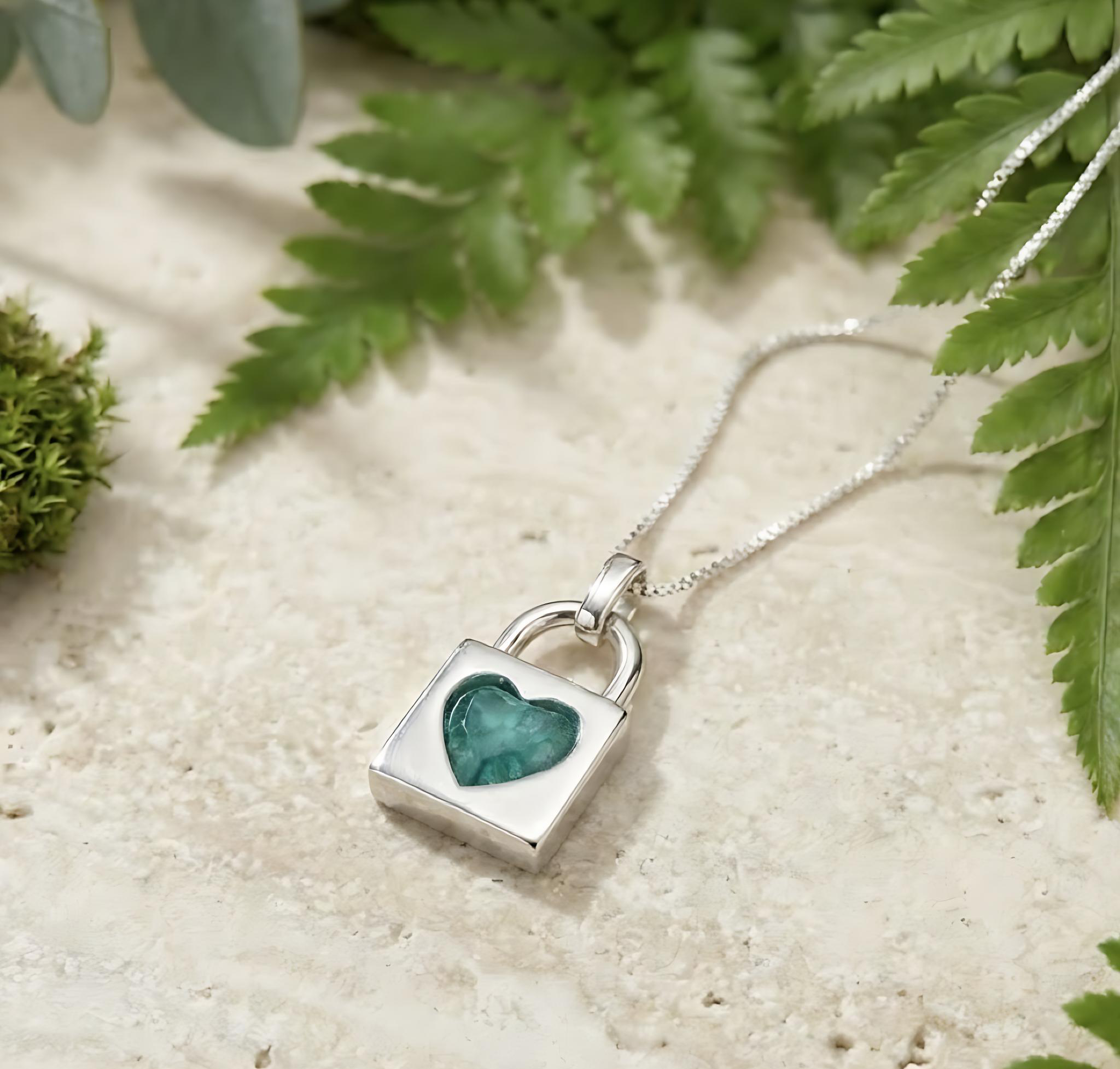 A delicate silver padlock featuring a heart at its centre, thoughtfully designed to hold a small inclusion such as ashes or a lock of hair. A timeless symbol of love, connection and remembrance, this piece can be worn close to the heart or gifted as a meaningful keepsake to mark a special bond or cherished memory.