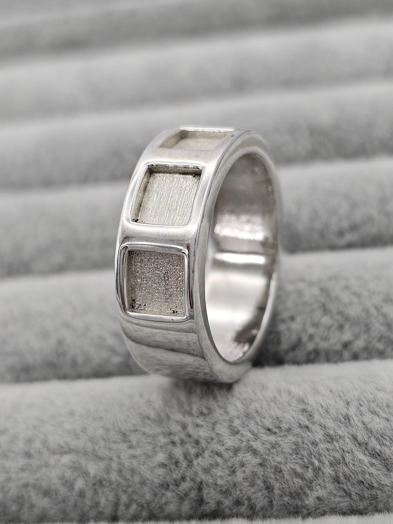 Bold and Meaningful our Triple Square Ring in Sterling Silver is a classic piece of jewellery.  Featuring three sleek square settings to hold the inclusions of your loved one, modern in design yet timeless in style. It’s a perfect way to keep what matters most close at hand.